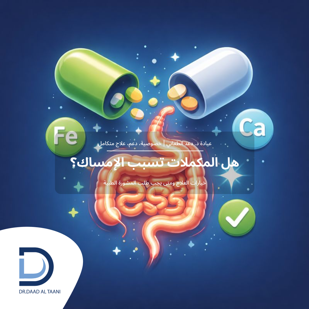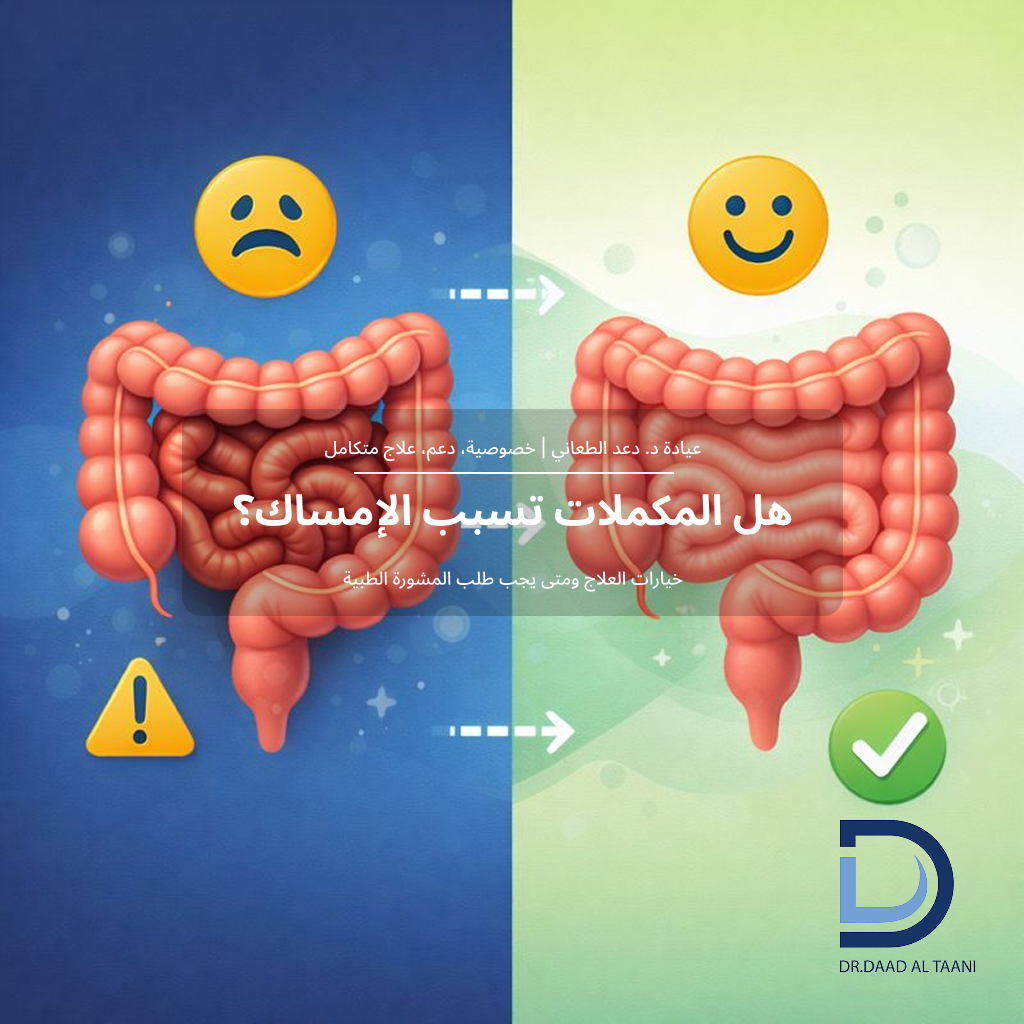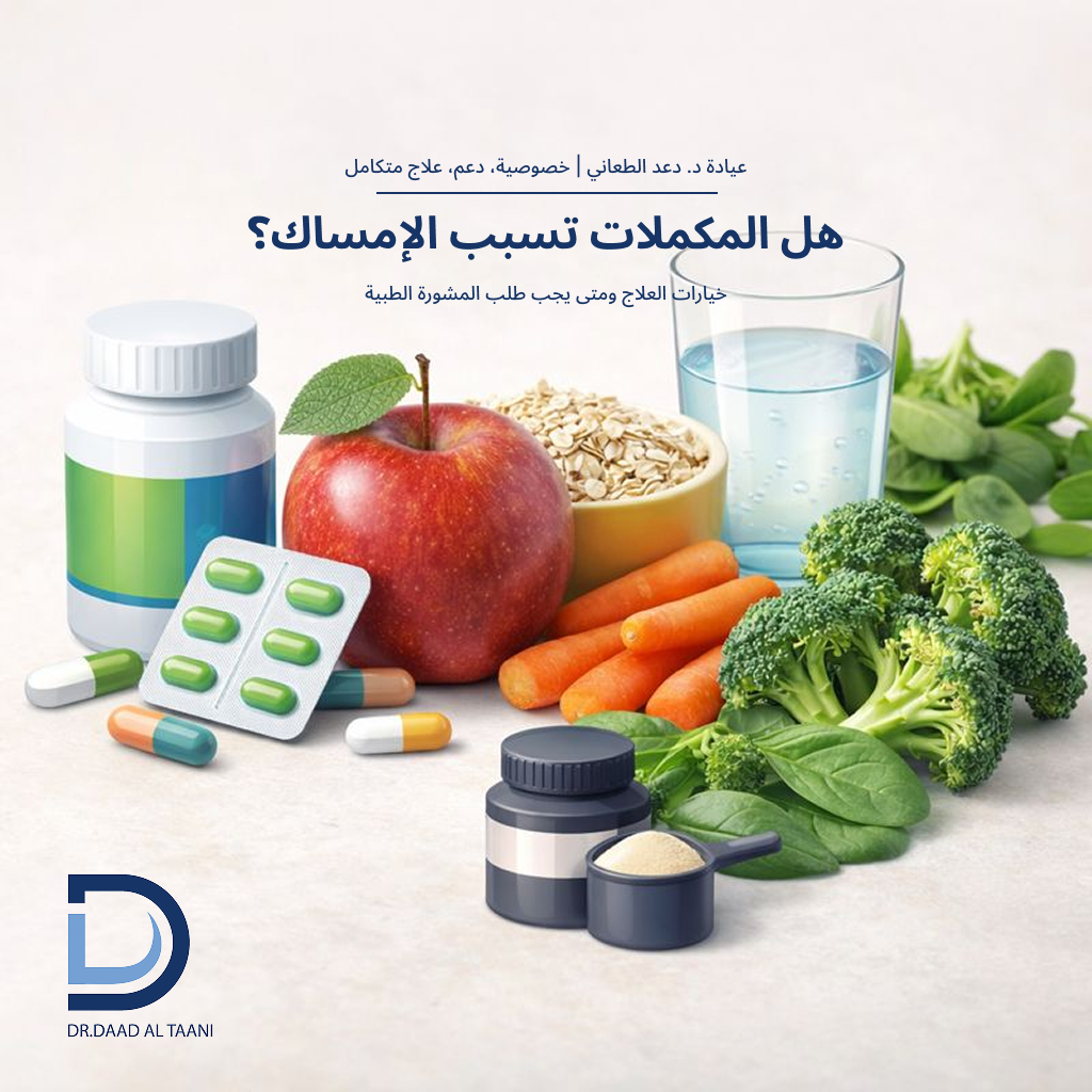 هل المكملات الغذائية تسبب إمساكًا؟ الأسباب والعلاج مع عيادة د. دعد الطعاني افضل طبية بواسير للنساء فى الامارات